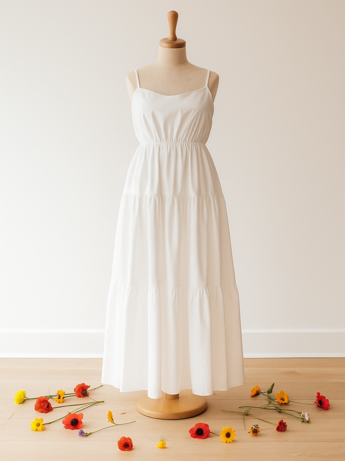 Bold, breezy, and probably banned from Coachella. This free-flowing silhouette flirts without trying. With a tie waist and spaghetti straps, she twirls on command and vanishes when the tab arrives. She's sunshine, but she'll set your world on fire.